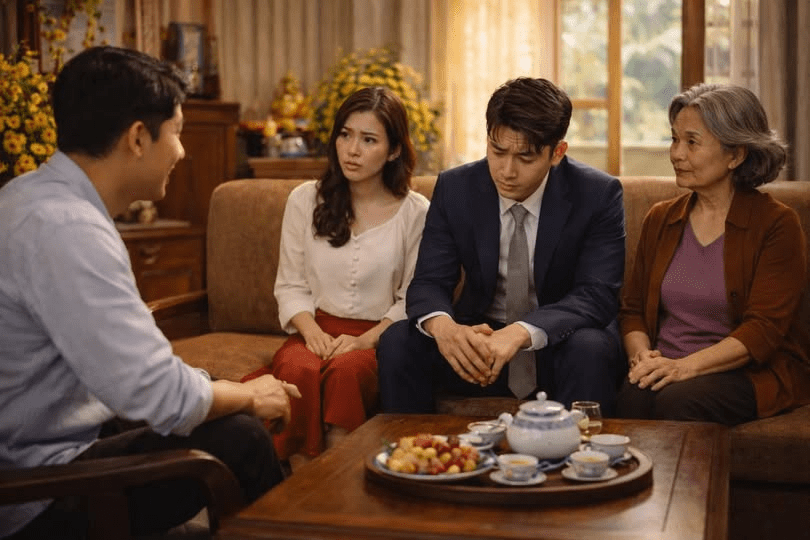 Tuấn đứng hình. Tim đập loạn xạ, miệng khô như bánh đa nướng. Trong đầu chỉ còn đúng một chữ: Em… họ?