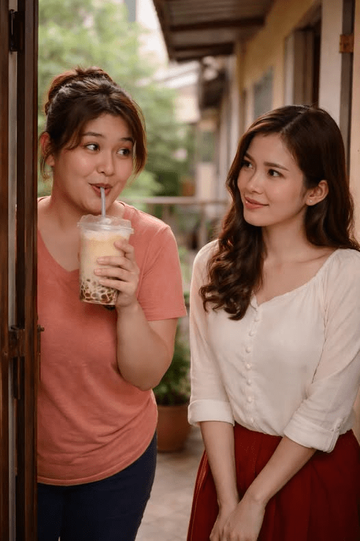 Đúng lúc ấy, chị phòng bên cạnh bước ra, tay cầm một ly trà sữa đang hút rột rột, mặt tươi rói như vừa trúng thưởng: