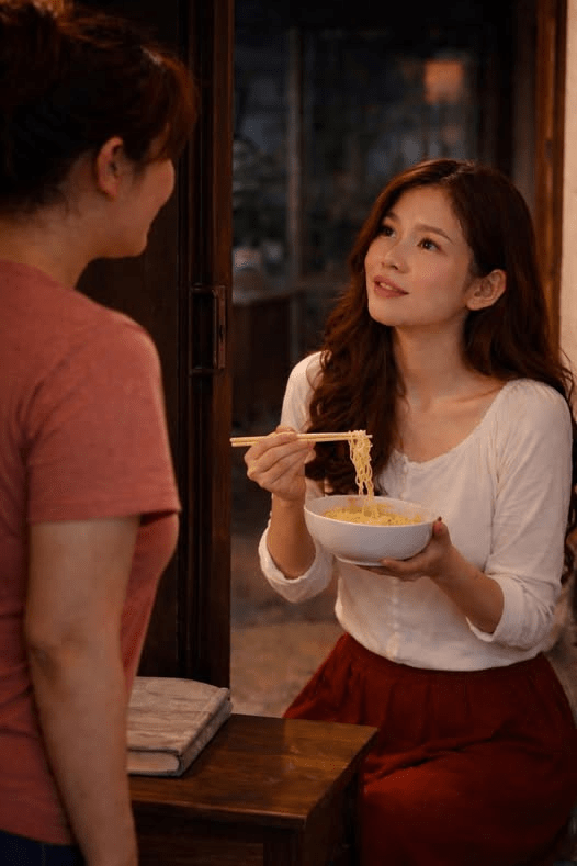Chị hàng xóm vừa về phòng, Trang mới bưng bát mì lên ăn tiếp.