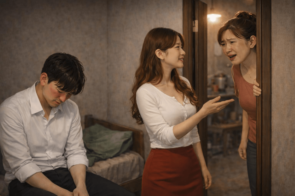 Chị hàng xóm nghe “đãi trà sữa” là cười híp mắt rồi đi thẳng. Trang quay vào phòng, đóng cửa cái “rụp”. Lúc này Tuấn mới dám thò cái mặt đỏ tía tai ra khỏi góc phòng, giọng mếu máo như đứa trẻ bị bắt quả tang ăn vụng: